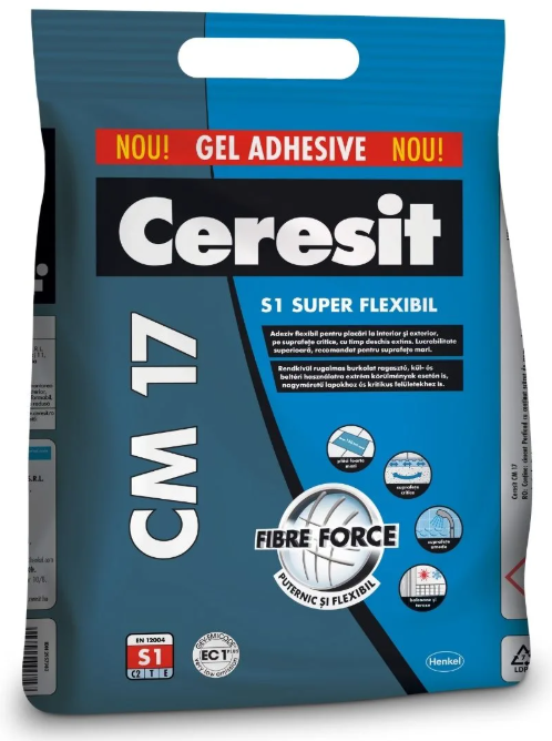 Ceresit CM 17 este un adeziv flexibil cu aderenta superioara, destinat lucrarilor de placare pe suprafete critice, atat la interior cat si la exterior. Este recomandat pentru placi ceramice de dimensiuni mari si pentru piatra naturala, oferind performanta ridicata chiar si in conditii dificile, inclusiv in medii umede. Poate fi utilizat pe suprafete suport compacte, curate si uscate, precum beton cu vechime de minimum 3 luni sau sape pe baza de ciment maturate cel putin 28 de zile, fara urme de grasimi, praf sau alte substante ce pot afecta aderenta. Datorita flexibilitatii si aderentei ridicate, este ideal pentru balcoane, terase, piscine, rezervoare de apa si alte zone expuse la umiditate, mai ales in combinatie cu sisteme de hidroizolatie, si permite inclusiv placarea peste suprafete vechi tratate si amorsate corespunzator. Se poate utiliza si pe suporturi deformabile precum gips carton, OSB sau PAL tratat. Suprafata devine circulabila dupa aproximativ 12 ore, iar timpul deschis de lucru este de circa 30 de minute, cu un timp de aplicare de aproximativ 2,5 ore. Temperatura optima de aplicare este intre 5 si 30 grade Celsius, iar consumul variaza intre 1,4 si 5 kg pe metru patrat in functie de aplicare si dimensiunea placilor.