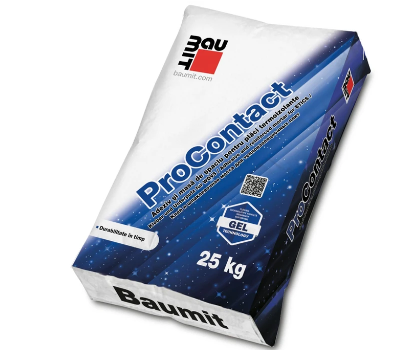 Baumit ProContact este un mortar adeziv permeabil la vapori de apa, utilizat atat la interior, cat si la exterior, destinat in special lipirii placilor termoizolante pentru fatade din polistiren EPS-F, placilor si lamelelor din vata minerala, pluta, precum si pentru inglobarea plasei din fibra de sticla. Poate fi folosit si ca masa de spaclu sau pentru nivelarea tencuielilor de grund, cu sau fara plasa din fibra de sticla. Suprafata suport trebuie sa fie impermeabila, curata, cu capacitate portanta, fara praf, vopsea, materiale de decofrare, eflorescente saline sau zone inghetate ori friabile. Adezivul se prepara prin turnarea continutului unui sac de 25 kg in aproximativ 6 litri de apa curata, amestecandu-se cu mixerul la turatie redusa, apoi se lasa 5 minute si se reamesteca; se recomanda utilizarea intregului continut al sacului. Nu este indicata prelucrarea la temperaturi sub 5?C sau pe suporturi inghetate ori expuse riscului de inghet.