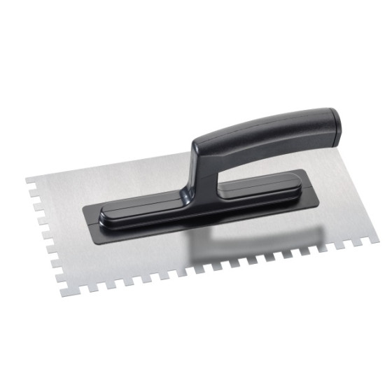 Drisca dintata inox 8×8 mm, 270×130 mm 94060810 este un instrument practic utilizat pentru aplicarea uniforma a adezivilor la montajul placilor ceramice, gresiei sau faiantei. Lama din inox ofera rezistenta ridicata la uzura si coroziune, iar dintii de 8×8 mm permit distribuirea corecta a adezivului pe suprafata de lucru, asigurand o aderenta optima a placilor. Manerul ergonomic ofera confort si control in timpul utilizarii, fiind potrivita pentru lucrari de constructii, renovari si finisaje profesionale.