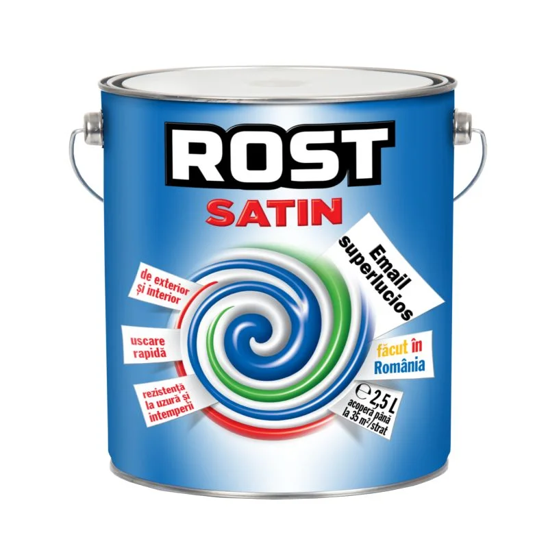Vopseaua superlucioasa Rost Satin este realizata pe baza de rasini alchidice grase, sicativi, pigmenti, extenderi si solventi organici, fiind utilizata atat ca strat final pentru protectia structurilor metalice, cat si pentru decorarea si protectia suprafetelor din lemn si zidarie, la interior si exterior, oferind o pelicula uniforma si lucioasa. Produsul are o buna capacitate de etalare, aderenta excelenta la suportul pregatit corespunzator si rezistenta ridicata la intemperii si uzura. Inainte de aplicare se omogenizeaza bine si se foloseste nediluat, in doua straturi, aplicate cu pensula sau rola, cu un randament de 10 ? 14 mp/litru/strat. Timpul de uscare este de aproximativ 3 ore la atingere, 12 ore pentru reacoperire si 24 de ore pentru manipulare. Produsul are o cantitate de 2.5 litri si este destinat suprafetelor din metal, lemn si zidarie, iar nuantele din paletar pot prezenta mici diferente fata de cele reale.