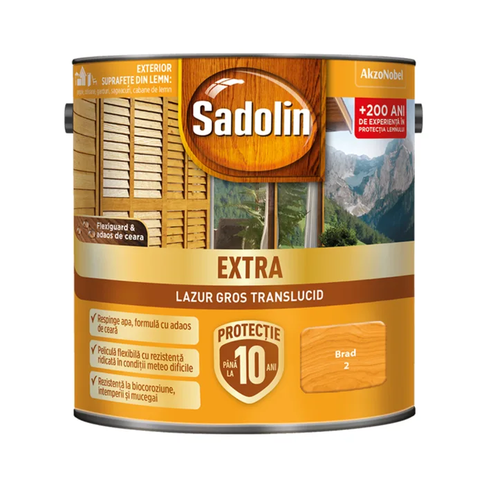 Lazurul gros pentru lemn Sadolin EXTRA pe baza de solvent este realizat din rasina sintetica in solvent organic, cu pigmenti rezistenti la radiatii UV si intemperii, fiind recomandat pentru protectia suprafetelor exterioare din lemn precum elemente de constructii, fatade, garduri, mobilier de gradina sau ornamente. Formeaza un strat protector durabil, cu aspect translucid, care protejeaza eficient impotriva factorilor de mediu si a daunatorilor lemnului, fara a fi recomandat pentru suprafete aflate in contact direct cu alimente, furaje sau apa potabila. Se aplica pe lemn curat, uscat si sanatos, la temperaturi intre 5?C si 30?C, evitand umiditatea ridicata si expunerea directa la soare, dupa omogenizarea produsului, folosind pensula in directia fibrei lemnului. Sistemul recomandat include 1-2 straturi de grund Sadolin Base NR urmate de 2-3 straturi de lazur, cu timp de uscare de aproximativ 2 ore la atingere si 24 ore in profunzime si intre straturi. Consumul este de aproximativ 12-15 mp/litru pentru lemn finisat si 6-8 mp/litru pentru lemn nefinisat, in functie de suprafata si conditii. Uneltele se curata imediat dupa utilizare cu diluant sintetic, iar produsul se depoziteaza in ambalaj original, bine inchis, la temperaturi intre 5?C si 30?C, ferit de surse de caldura, avand o valabilitate de pana la 60 de luni. Se recomanda utilizarea in spatii bine ventilate, evitarea contactului cu pielea si ochii si respectarea regulilor de siguranta privind depozitarea si eliminarea produsului.