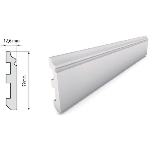 Plinta alba duropolimer DP5, realizata prin tehnologia PVC FREE (HDPS) din polimer dur extrudat, este o solutie moderna si ecologica pentru finisarea pardoselilor, avand inaltime de 79 mm, lungime de 2000 mm si rost de dilatare de 12,6 mm, fiind rezistenta la apa si ideala pentru bai, bucatarii sau alte zone cu umiditate ridicata, fara a se exfolia sau umfla precum plintele din MDF. Datorita flexibilitatii pe raza mare, se adapteaza usor la denivelarile peretilor, iar sina integrata permite mascarea unui numar mare de cabluri, oferind acces rapid in spatele plintei pentru adaugarea sau eliminarea acestora. Se poate vopsi in orice culoare (recomandat cu amorsare prealabila), se curata usor cu un burete umed si ofera rezistenta superioara in timp fata de plintele din MDF sau PVC, fiind compatibila cu orice tip de pardoseala, precum parchet, gresie, linoleum, piatra, mocheta sau alte finisaje de podea.