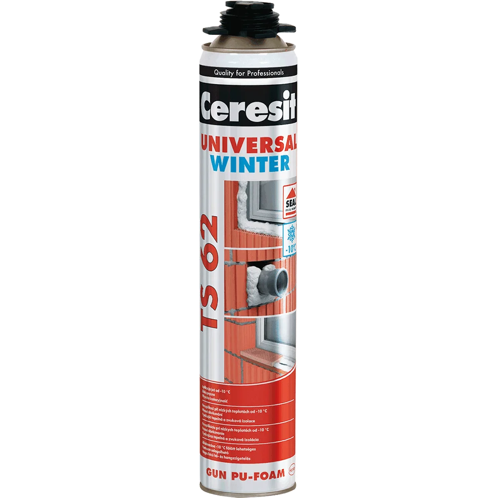 Ceresit TS 62 este o spuma poliuretanica de pistol, monocomponenta, gata de utilizare, cu expandare controlata si intarire la umiditate. Este ambalata in tuburi sub presiune prevazute cu filet special pentru fixarea pistolului de aplicare. Spuma este autoexpandabila, formeaza o pelicula dupa aproximativ 15 minute, iar intarirea completa se realizeaza in maximum 24 de ore. Este utilizata pentru montarea ferestrelor si ramelor de usi, umplerea golurilor, etansarea spatiilor deschise din acoperisuri si materiale de izolatie precum panouri sandwich, realizarea de bariere fonoizolante, umplerea golurilor din jurul tevilor si fixarea panourilor termoizolante sau a placilor de acoperis. Ofera aderenta foarte buna pe majoritatea materialelor, izolare termica si acustica ridicata, rezistenta la umiditate si capacitate mare de umplere. Permite dozare precisa cu pierderi minime si are rezistenta ridicata la imbatranire.